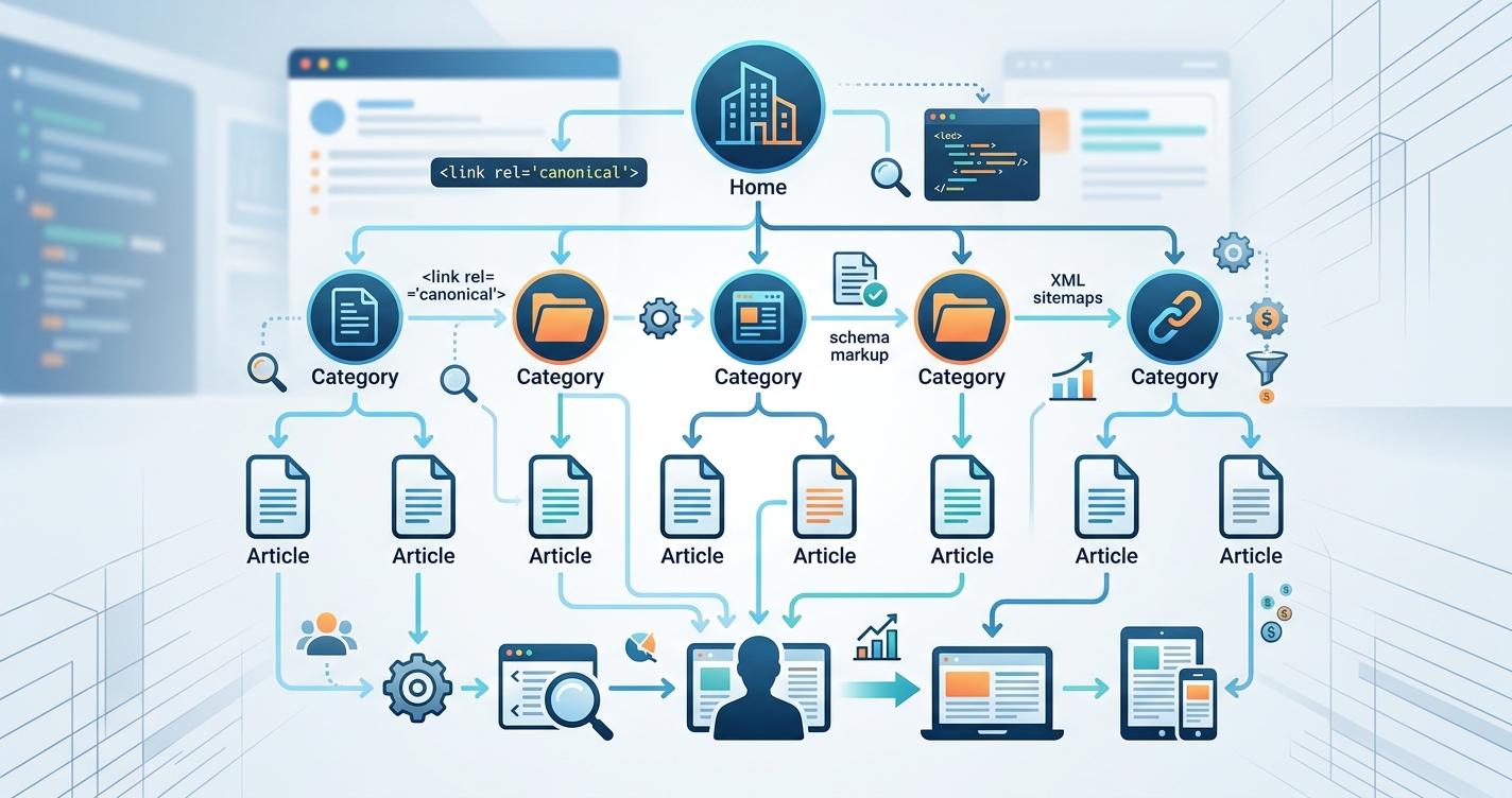 Website structure for SEO means organizing your content so search engines can crawl it efficiently and users can find what they need fast. A logical hierarchy with clear categories, smart internal linking, and shallow click depth improves rankings, reduces bounce rates, and increases conversions. Most sites fail because they add pages without planning how everything connects.